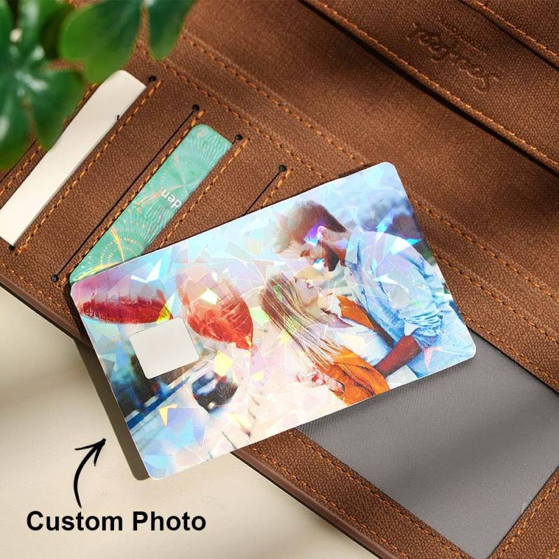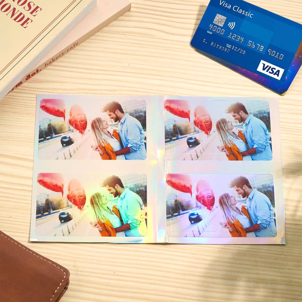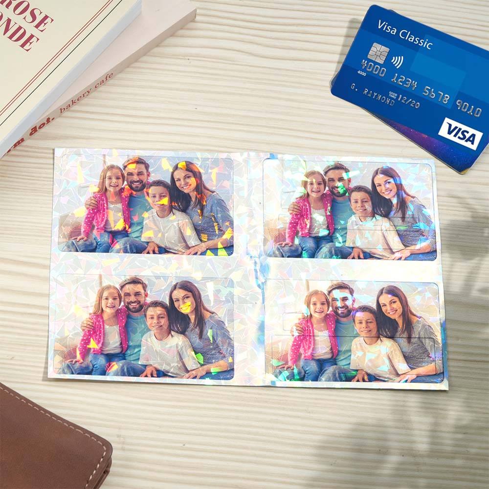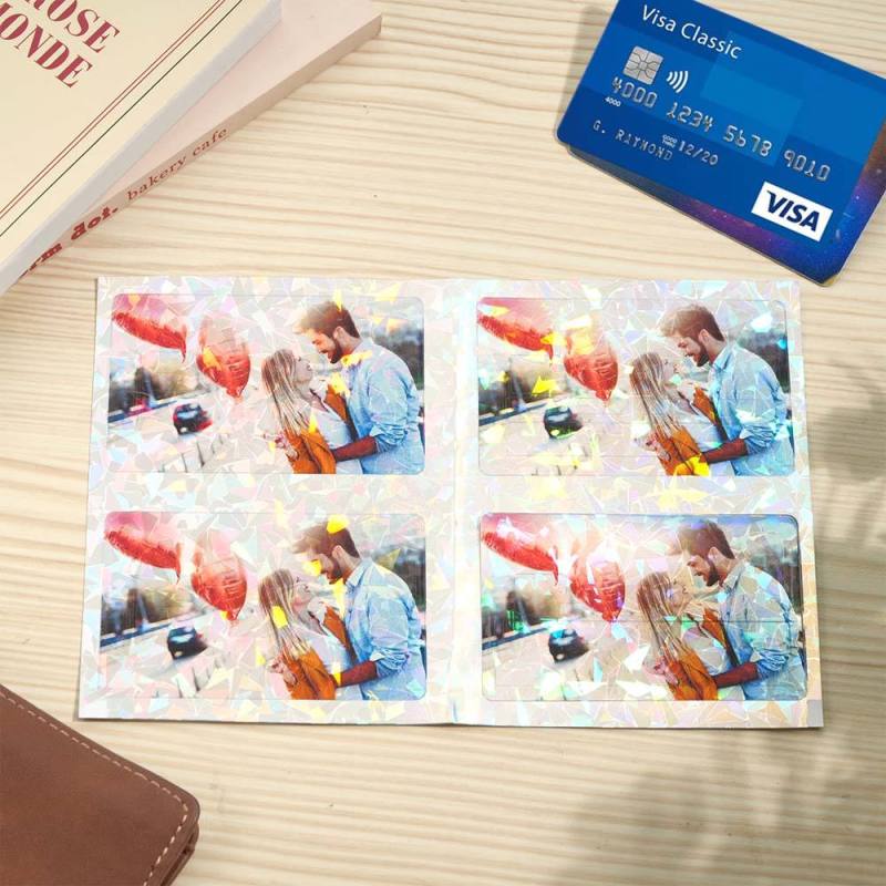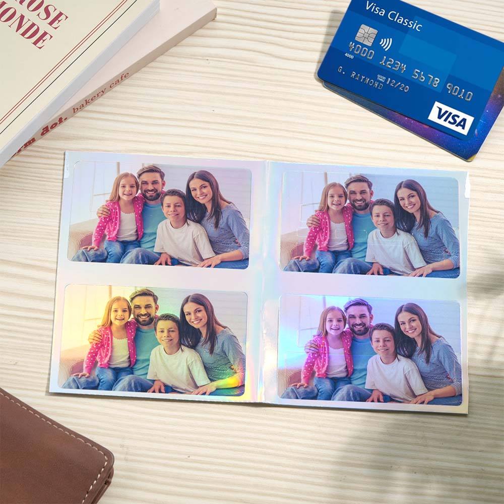 Enhance and protect your cards with this personalized card cover set includes four waterproof, custom photo stickers compatible with both Small and Big Chip cards. Choose from Holo Diamond, Rainbow, Dots, Stars, or Matte finishes without affecting card swiping functionality.