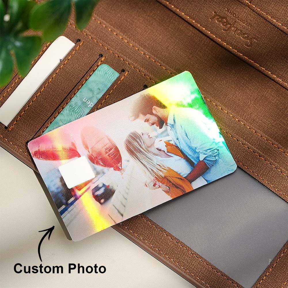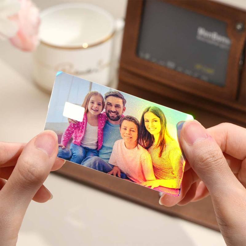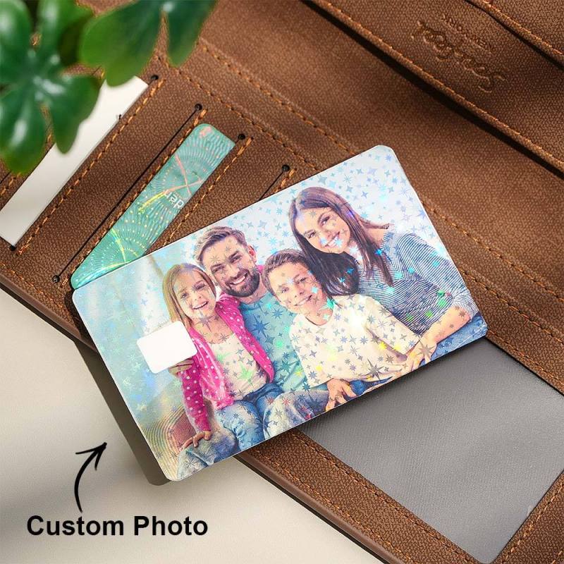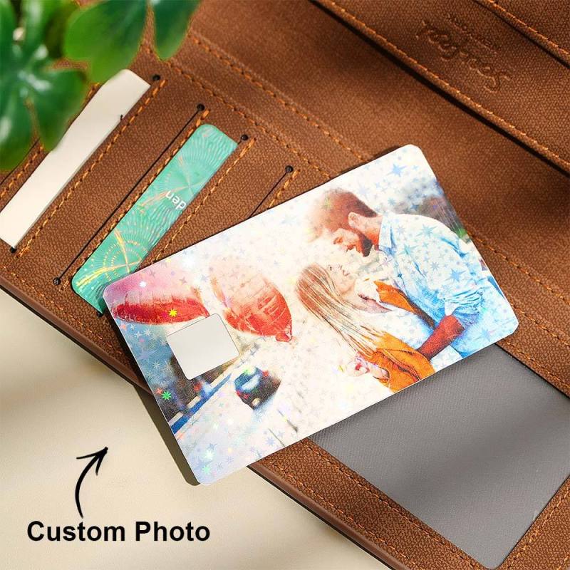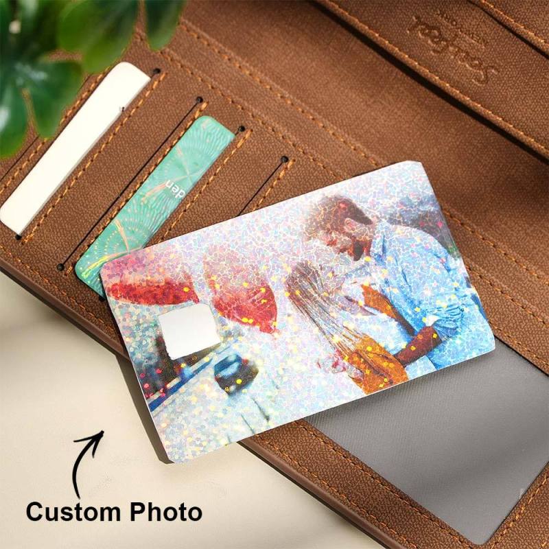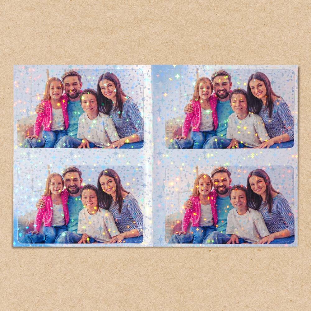 Enhance and protect your cards with this personalized card cover set includes four waterproof, custom photo stickers compatible with both Small and Big Chip cards. Choose from Holo Diamond, Rainbow, Dots, Stars, or Matte finishes without affecting card swiping functionality.