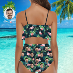 Custom Swimsuit Face High Waisted Bikini Suit Gift For Her - Leaves & Flamingo